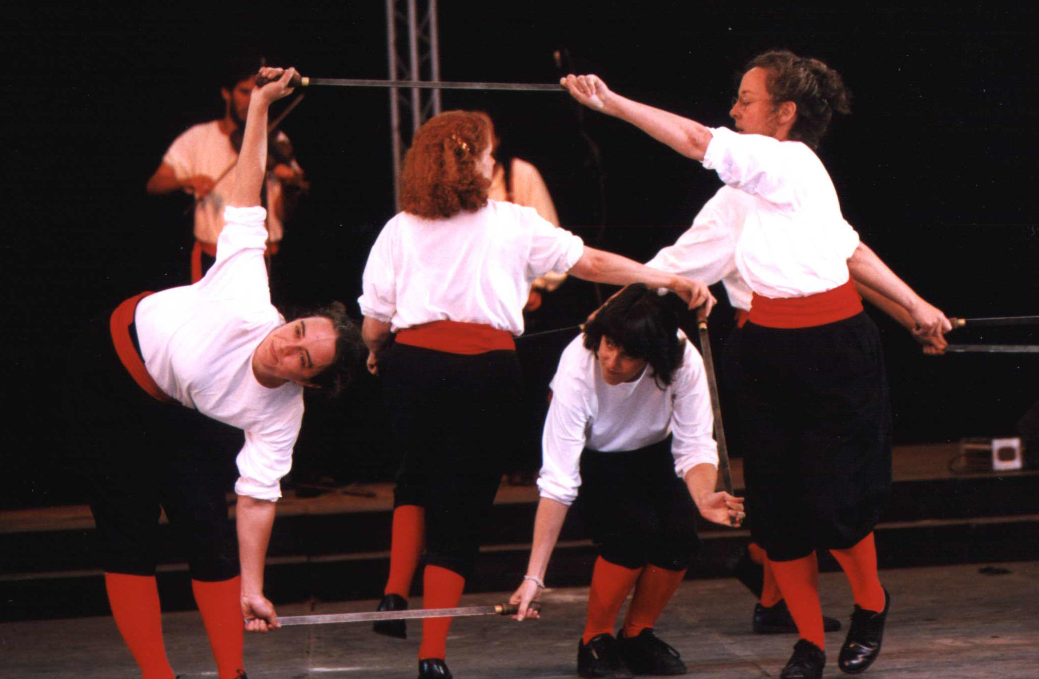 In the next six beats, #1 and #6 turn to the bottom of the set, turn towards and then away from each other and roll under their own swords. #2 and #5 turn away from each other, swing their swords over their own heads and those of #3 and #4 and change places with them, while #3 and #4 go to the top of the set under #2 and #5 swords, then turn away from each other and roll under their own swords.